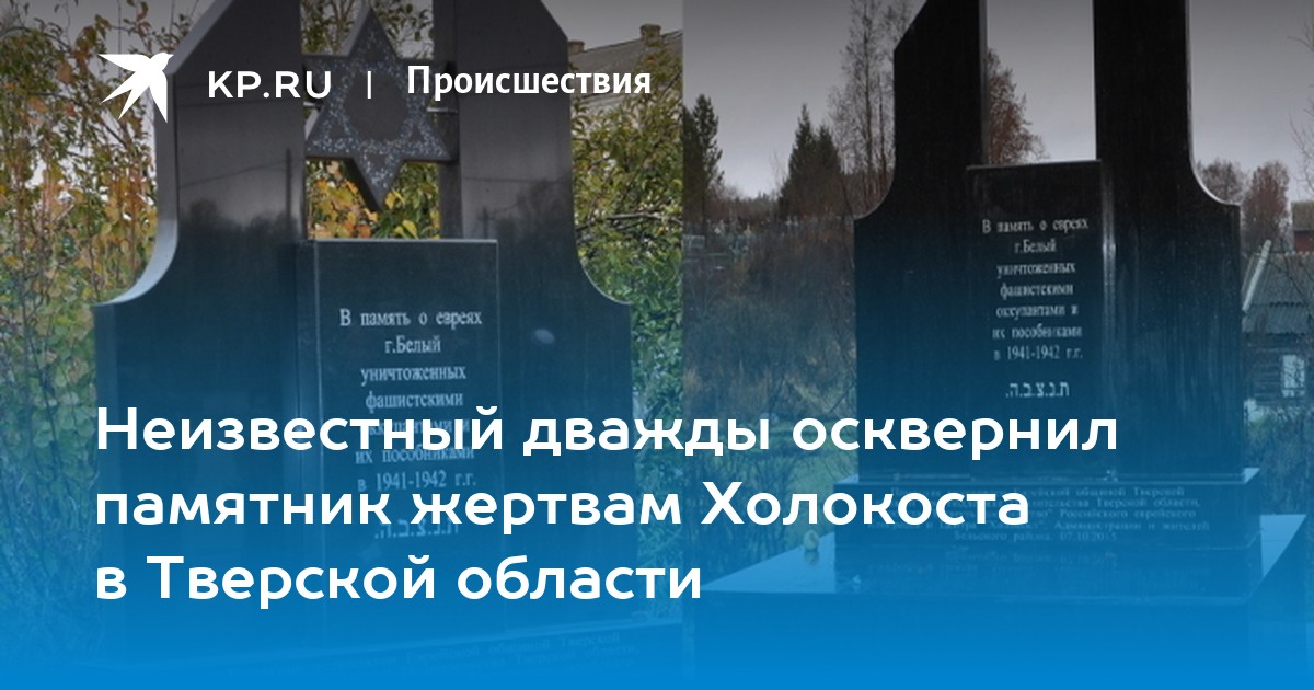 На окраине Тверской области в городе Белый памятник жертвам Холокоста дважды подвергся нападению неизвестных вандалов. Хотя, возможно, это был один человек, его сейчас ищет полиция. Памятник возвела на свои средства еврейская община Тверской области на местном кладбище. Во время Великой Отечественной войны эсэсовцы расстреляли там несколько сотен проживавших в Белом и окрестностях евреев. Местные жители, памятуя о трагедии, через некоторое время стали приносить к мемориалу свежие цветы и зажжённые свечи. Первое осквернение памятника произошло 22 октября. Установленный на местном кладбище мемориал — две стелы со звездой Давида между ними - был облит краской. Дело оказалось не фатальным - краску оттёрли и мемориал стал как новый. Второй налёт произошёл вечером 4 ноября. Предположительно, те же лица (или лицо) ударом тяжёлого предмета откололи звезду Давида. - Полиция опрашивает подозреваемых, вначале подумали на одного подростка, якобы у него была той же краской испачкана куртка, но оказалось, что это не он. - Поделилась с «Комсомолкой» глава администрации городского поселения города Белый Ирина Колмыкова. - В целом мемориал не сильно пострадал, но отколот центральный элемент, что конечно портит впечатление. Очень грустно, что в наших краях нашлись вандалы, такой замечательный мемориал испортили, надеюсь, злоумышленников найдут как можно скорее. - Мемориал на свои установили четыре месяца назад, по согласованию с местными властями и общественностью, - сообщил «КП» руководитель Российского еврейского конгресса в Тверской области Давид Блицман. - Пока злоумышленника не найдут восстанавливать не будем, ведь вандал снова может разрушить памятник. Общий ущерб составил примерно 70 - 80 тысяч рублей, а ведь деньги люди собирали добровольно, каждый вносил посильный вклад, очень жаль если их труды опять будут разрушены. По каждому эпизоду вандализма в городе Белом возбуждены два уголовных дела. «Комсомолка» будет следить за развитием событий.